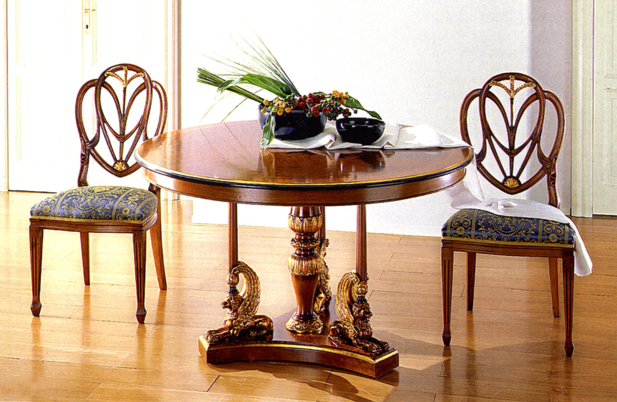Dining table from the Italian manufacturer Brogiato. The frame is made from solid wood. The elements - gold leaf. Model round shape. Perfect choice for classic style. Colors: natural wood color, brown.