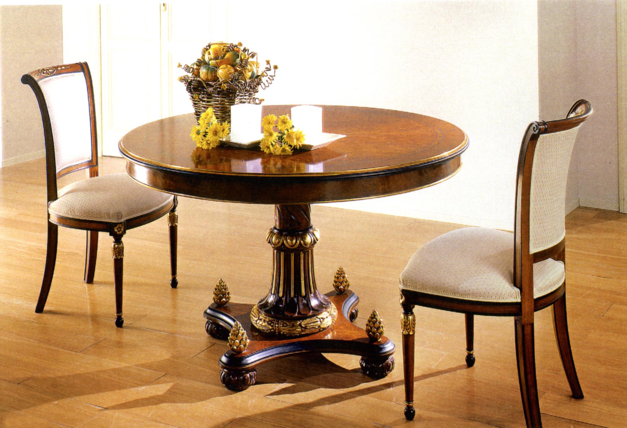 Dining table from the Italian manufacturer Brogiato. The frame is made from solid wood, the decorations - gold foil. Model round shape. Perfect choice for classic style. Colors: natural wood color, brown.