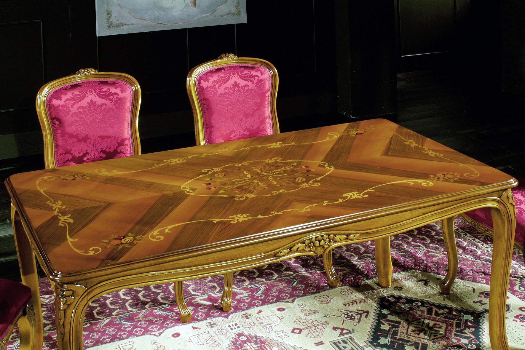 Dining table from the Italian manufacturer Brogiato. The frame is made from solid wood. The top is decorated with inlay. The model is rectangular. Good choice for dining room in classic style. Product color natural wood.