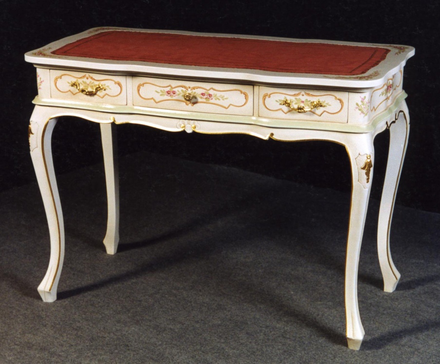 Desk from the Italian manufacturer Brogiato. The frame is made from solid wood, the surface is treated with a varnish of white color. Table top with leather insert. The model is decorated with inlay. Desk with three drawers. A pretty choice for interiors in classical style.