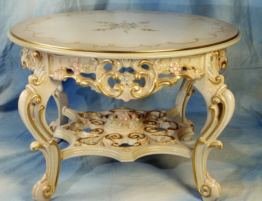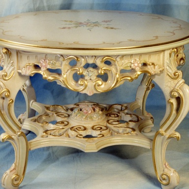 The table from the Italian manufacturer Brogiato. The frame is made from solid wood. Finish - gold foil/lacquer from the range of the campaign. The model is decorated with carved and inlaid decoration. Table round shape. A great choice for the interior in classic style.