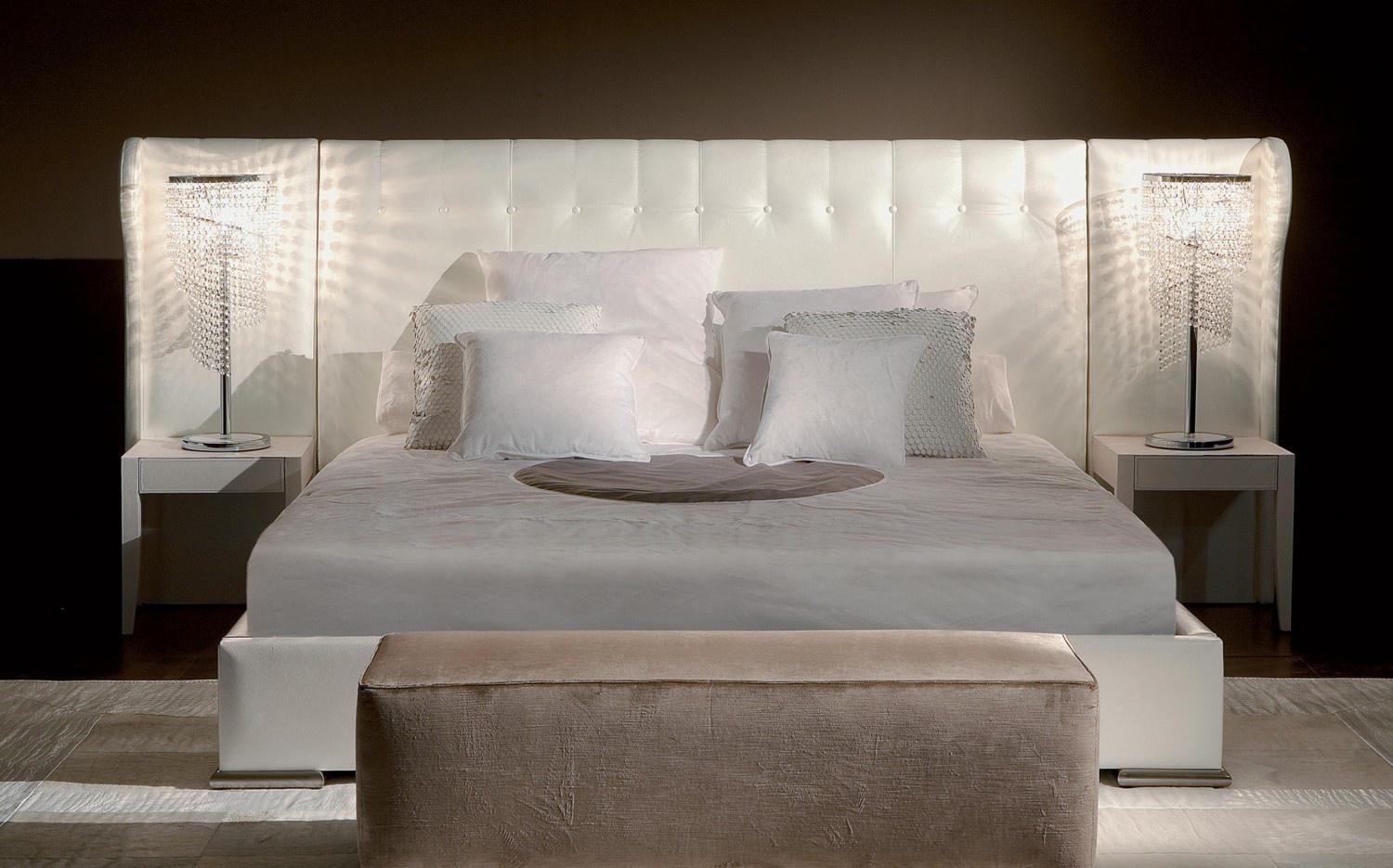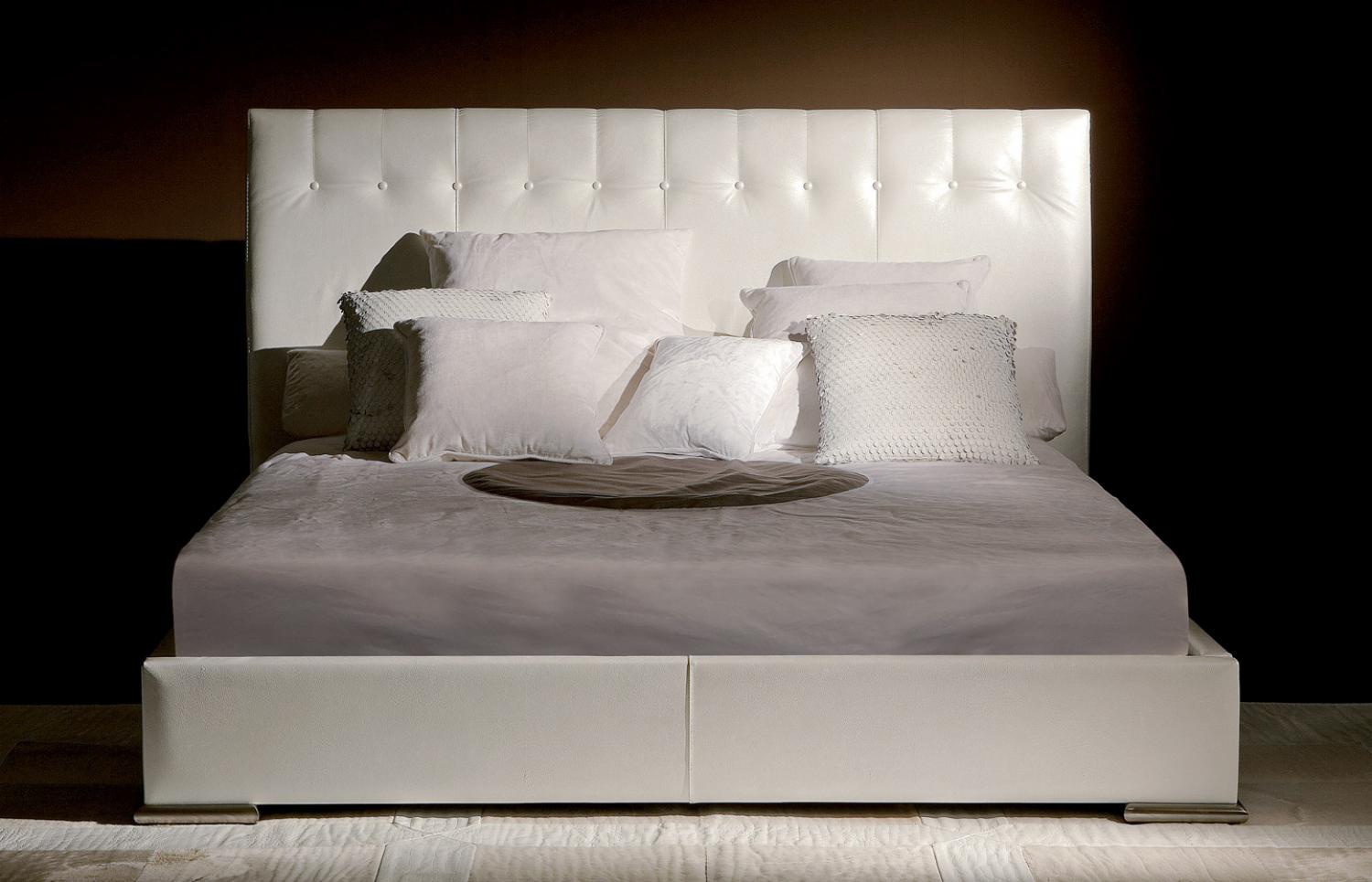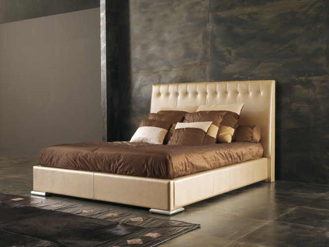 Bed with high headboard Damasco - Rugiano. Bed frame made from solid. Headboard is soft, covered with smooth leather, adorns the headboard stitch-Capito. For your convenience, the factory offers three sizes and the option container. The base is made in the leather colours offered by company directory. Additionally, the factory offers bedside tables on two legs, in the finishing of leather.