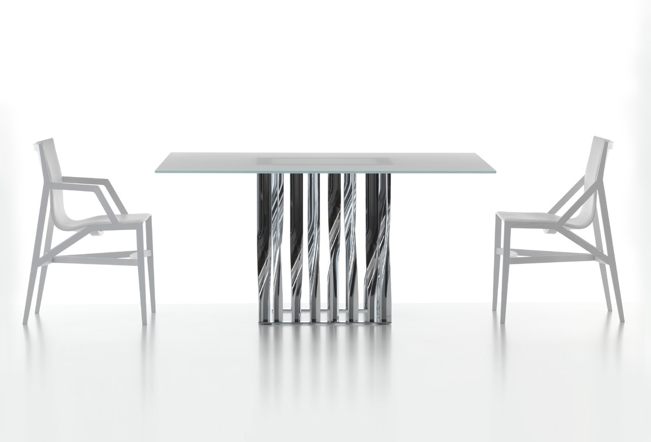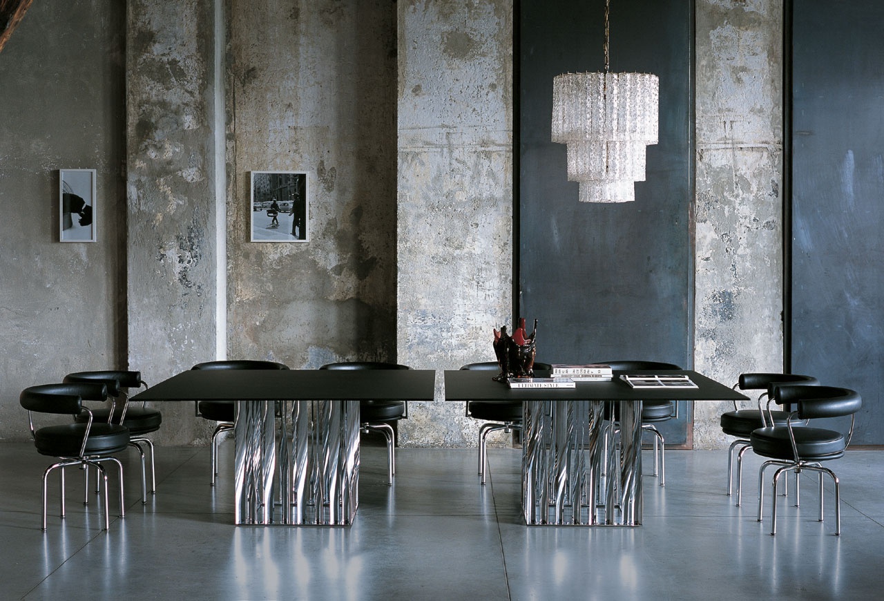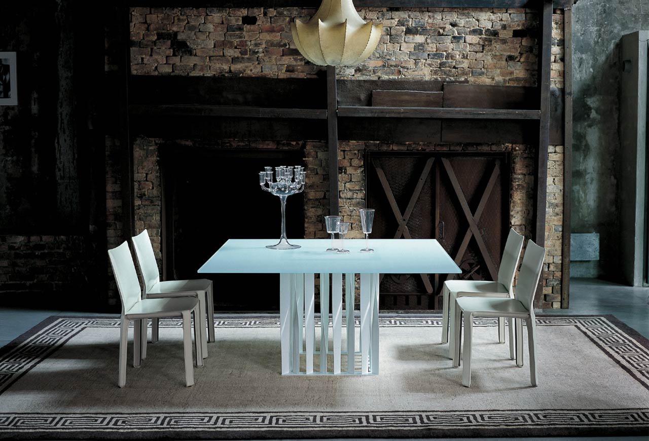 Dining table 475 BOBOLI Italian manufacturer Cassina. Square or round table with low-key geometric and original design. The frame is formed of iron plates and slats in extruded aluminum with color white or black lacquer. Selection of colours available in stock. Top glass or stone. The perfect solution for modern interior.