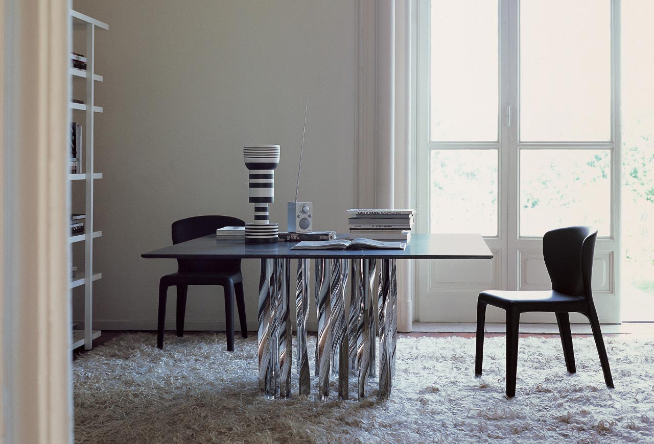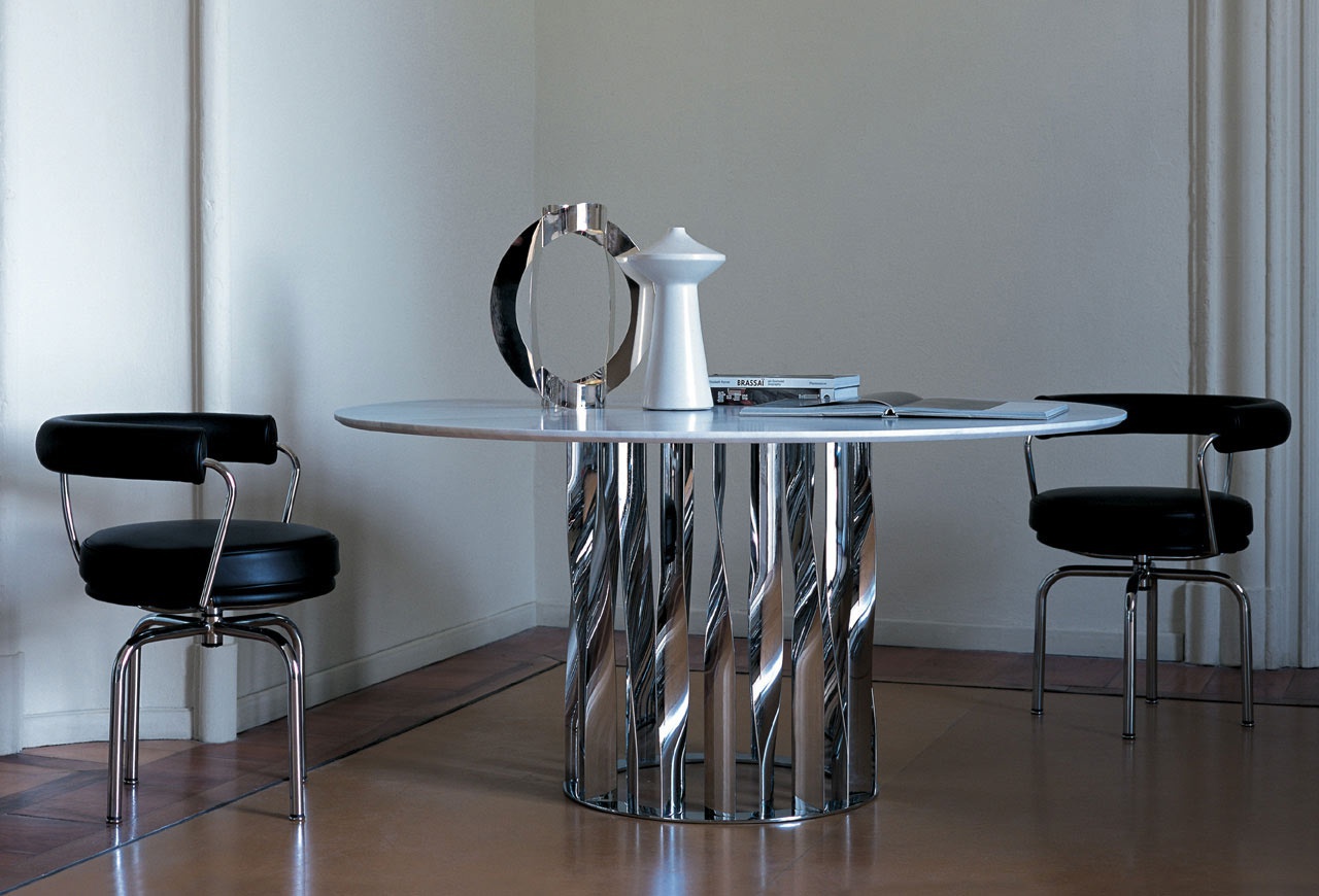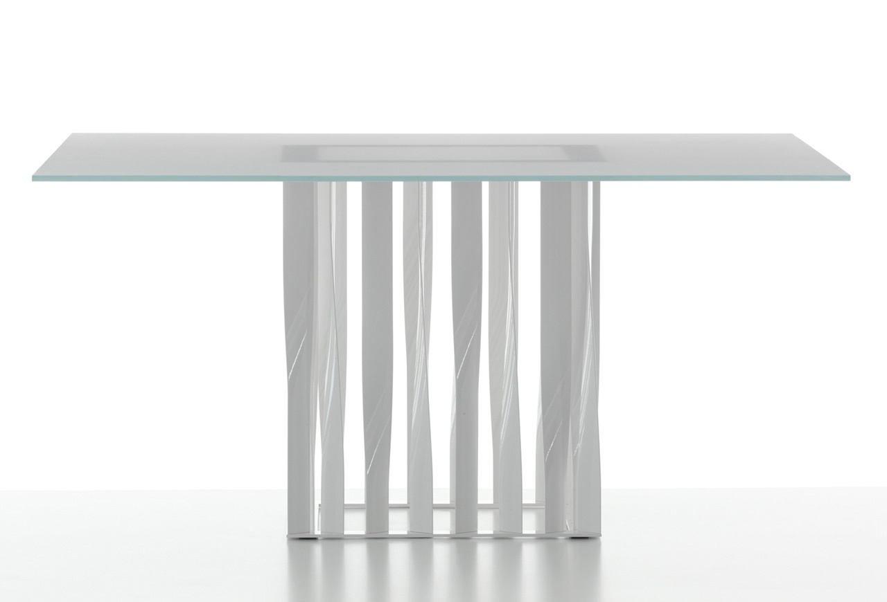 Dining table 475 BOBOLI Italian manufacturer Cassina. Square or round table with low-key geometric and original design. The frame is formed of iron plates and slats in extruded aluminum with color white or black lacquer. Selection of colours available in stock. Top glass or stone. The perfect solution for modern interior.