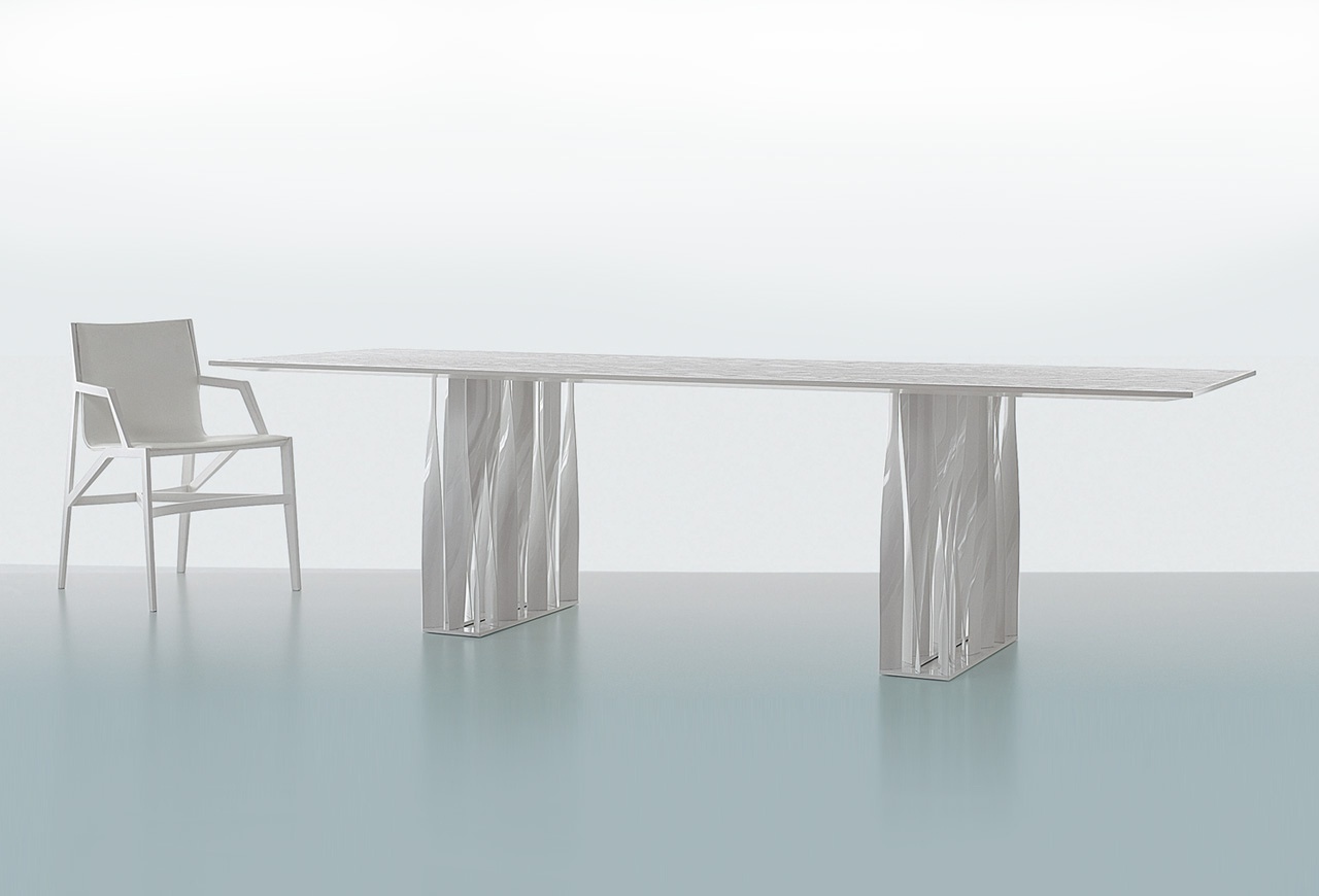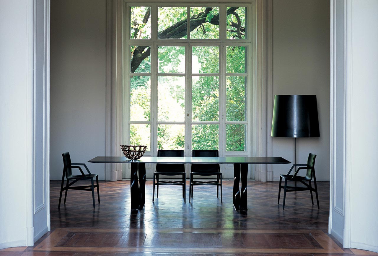 The 475 BOBOLI dining table from the Italian manufacturer Cassina. The rectangular table is made on a metal frame. The frame is formed of iron plates and slats in extruded aluminum with color white or black lacquer, chrome finish possible. Top glass or stone. Table with restrained geometric and original design. The perfect solution for modern interior.