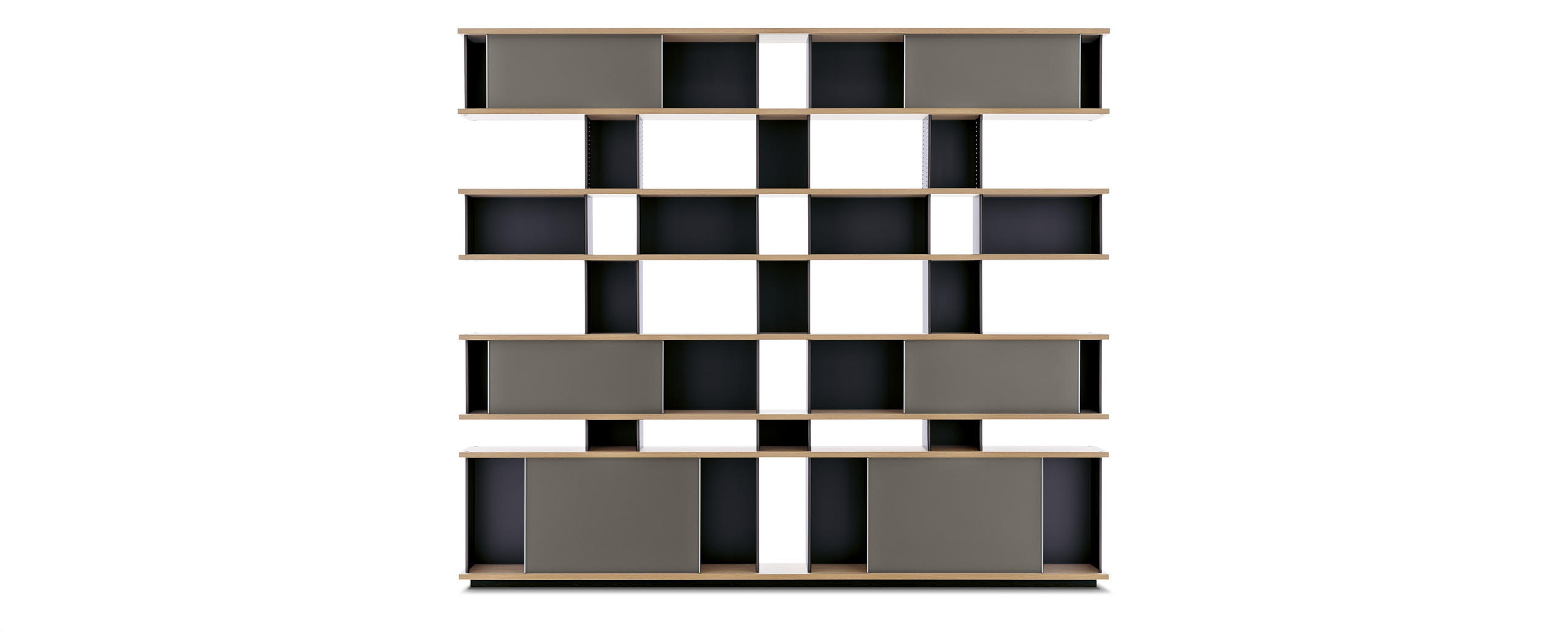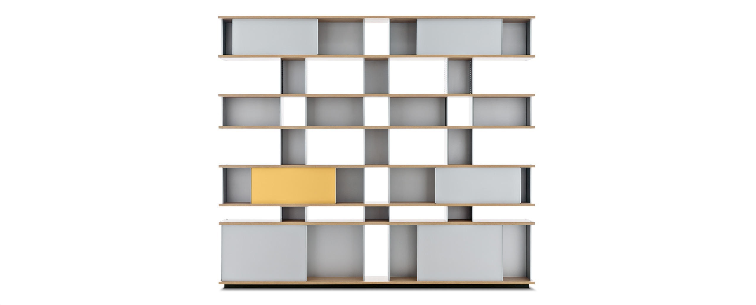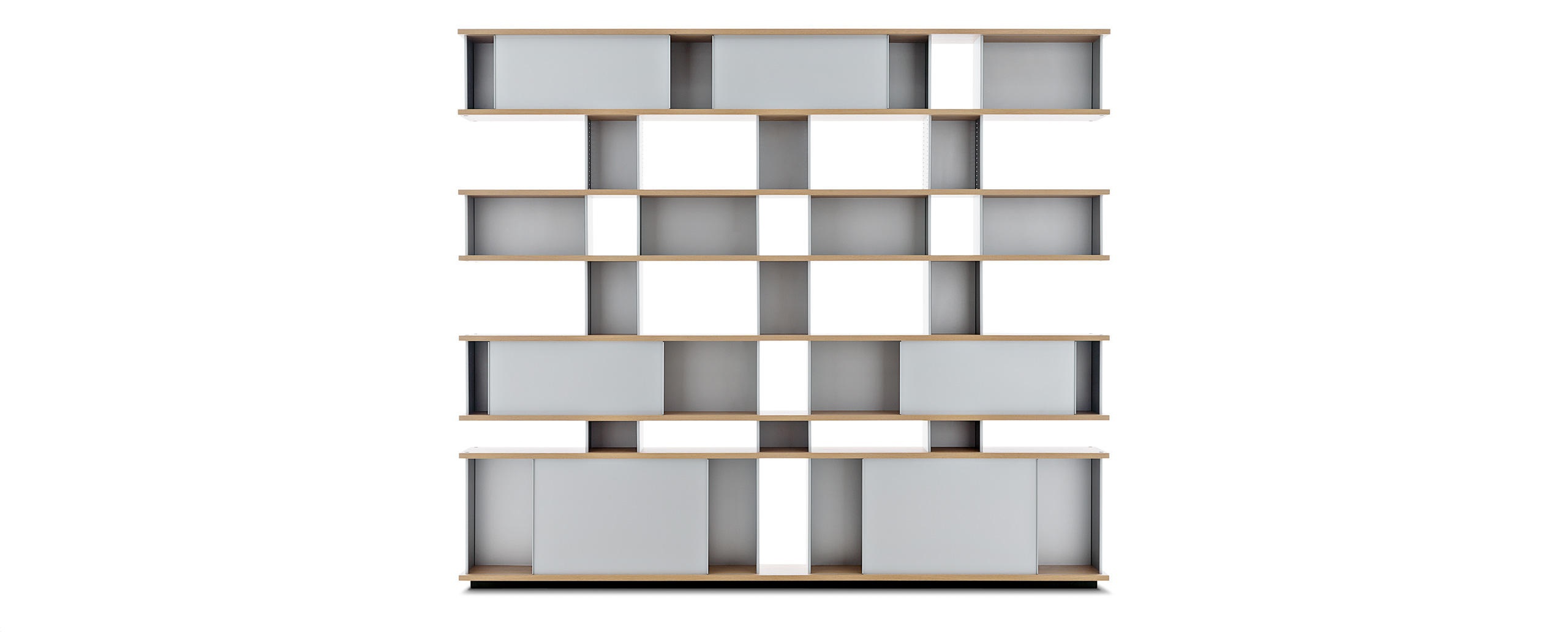 Nuage bookcase by Italian manufacturer Cassina. The Designer Charlotte Perriand. The base, top and shelves are made of solid oak. The sliding doors of anodized aluminium. The surface is treated with varnish from the range of the factory. A great choice for modern interiors. Colours in stock.