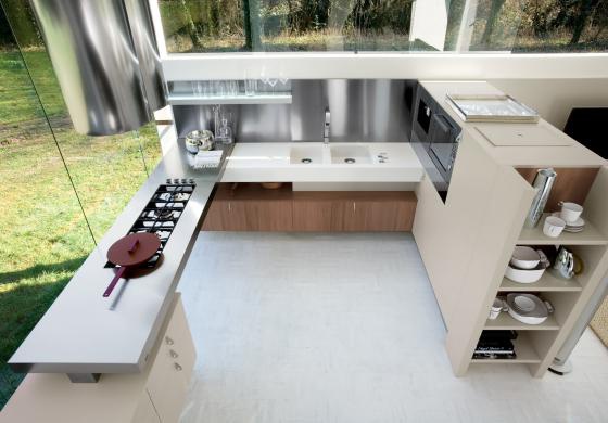 Dinamica kitchen from Italian manufacturer Antares Cucine. The facade is made of MDF lacquered or Matt lacquered. Finish in natural oak and walnut. The working area is stainless steel. Set in a contemporary style. Colours in stock.