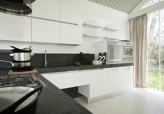 Sistema kitchen from Italian manufacturer Antares Cucine. The facade is made of solid wood, the base - metal. The surface is covered with a hook from the range of the campaign. Work area - stone. Set in a contemporary style. Colors: white, black.
