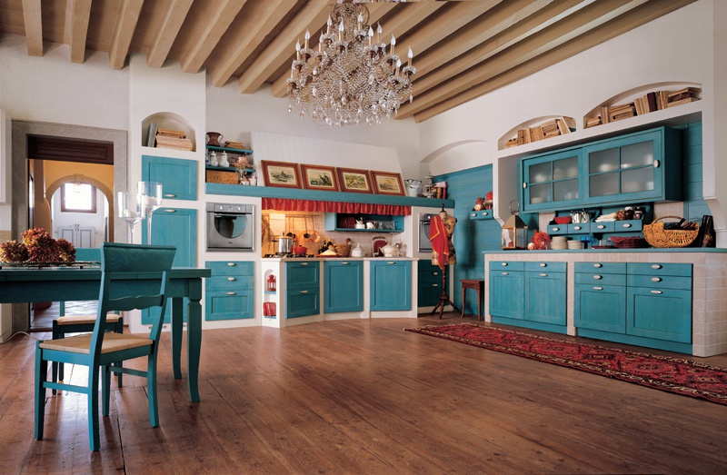 Tosco kitchen from Italian manufacturer Antares Cucine. The facade is made of solid wood, a work area - stone. The surface is treated with varnish from the range of the campaign. Sash - blind/frosted glass. Set in a classic style. Colors: white, blue.