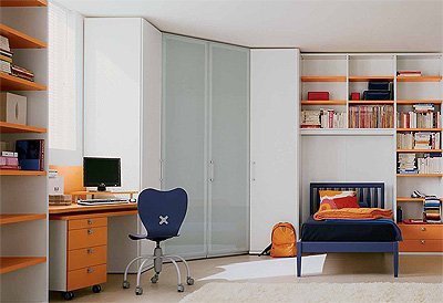 Headsets for children from the Italian manufacturer Battistella. Set includes a single bed, a chair on wheels, modular storage system, writing Desk and corner wardrobe. The furniture is made of chipboard. The front laminate. The surface is treated with varnish from the range of the campaign. Set a contemporary style. Colors: white, orange, blue.