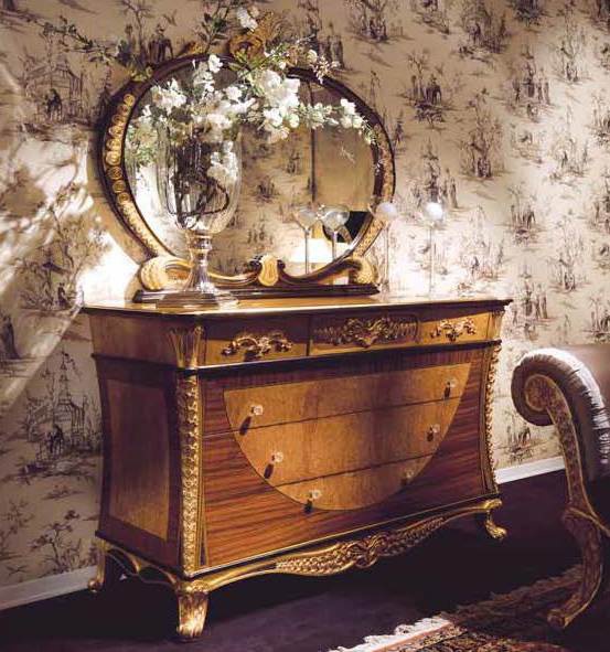 Headsets for bedrooms from Italian manufacturer Ezio Bellotti. Set includes double bed, settee in fabric, dressing table, stool and bedside tables. The furniture is made of solid wood. Upholstery - textiles from the company portfolio. Finish - lacquer and carved elements. The head - high, upholstered, with padding Capito and carved elements. The bench is made with soft armrests. Dressing table accompanied by a wide mirror. The model is made in classic style.