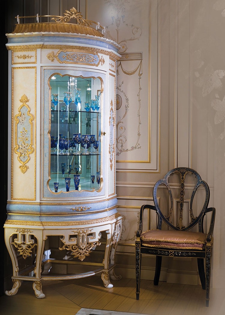 Corner showcase from the Italian manufacturer Ezio Bellotti. Material - wood. The model is decorated with luxurious decor. Shelves are made of glass. Ideal for living room or dining room in classic style. The choice of color in stock.