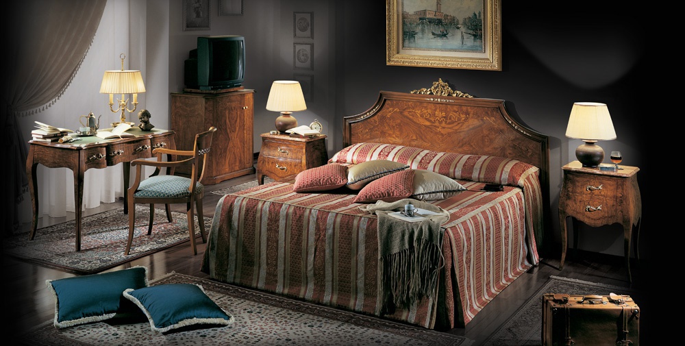 Headsets for bedrooms from Italian manufacturer Ezio Bellotti. Set includes double bed with high headboard, dressing table, armchair and bedside tables with metal fittings. The furniture is made of solid wood. Upholstery - textiles from the company portfolio. Finish - lacquer and carved elements.