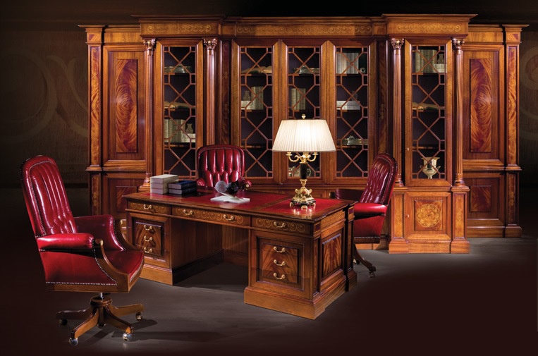 Desk from the Italian manufacturer Ezio Bellotti. The material is solid wood. The table is decorated with intarsia. The model for the office in classic style. Table top finished in natural leather. Fittings - metal. Colours in stock.