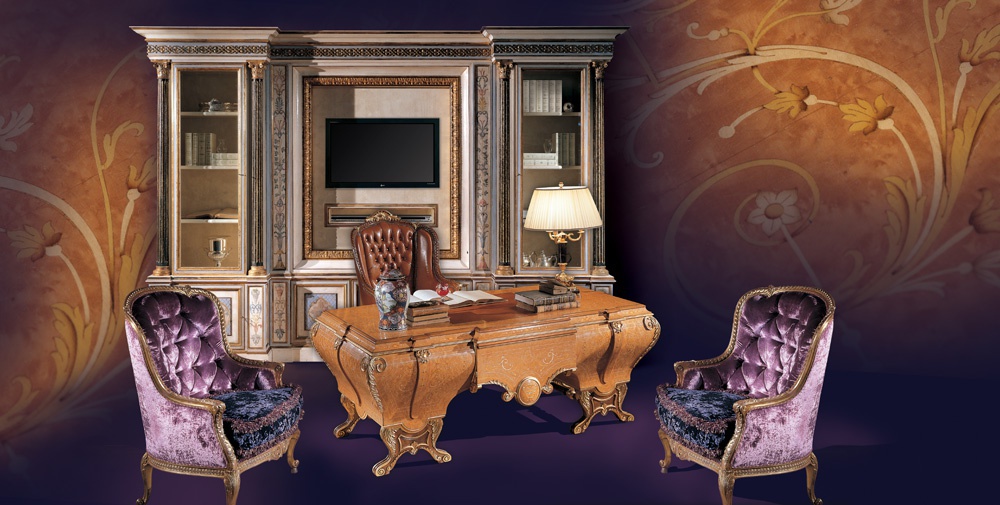 Desk from the Italian manufacturer Ezio Bellotti. The material is solid wood. The table is decorated with intarsia and carvings. Fittings - metal. The tabletop is decorated with natural leather. The table is made in Baroque style.