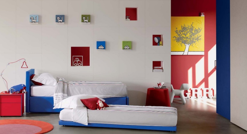Set for kids room from Italian manufacturer Flou. Set includes - two single beds, bedside Cabinet and wardrobe. The frames are made of wood. The finishing - varnish. Colors - white, blue, red. Model invite suitable for a boy bedroom. Set is made in modern style.