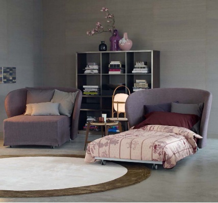 A chair from the Italian manufacturer Flou. The frame is completely hidden. Front legs wheels, rear direct from metal. Upholstery textile to choose from a collection company. Complement the design of the decorative cushions of different sizes.