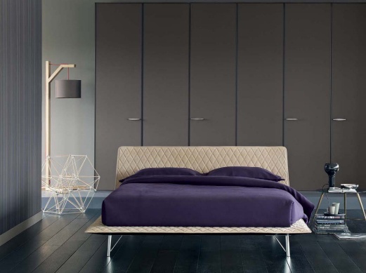 The bed is from Italian manufacturer Flou. The frame is made of wood and metal. Upholstery - textiles from a range of campaigns. The legs are made of metal. Product color - beige and grey. Bed with high headboard designed in a modern style.