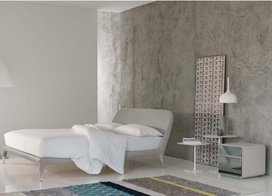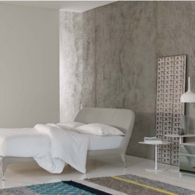 The bed is from Italian manufacturer Flou. The frame is made of metal and wood. Upholstery high headboard - leather from the company portfolio. The legs are made of metal. The head slightly tilts backward. The style is modern.