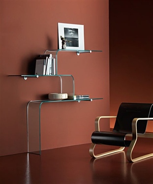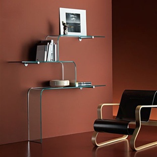Babila bookshelf from Italian manufacturer Fiam. The model is made of 10 mm curved glass. Holders of chromed metal. Modern transparent shelf rests a foot on the floor. Consists of three sections.