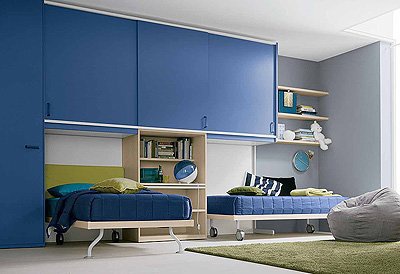 Headsets for children from the Italian manufacturer Battistella. Set includes two single bed one of which is on wheels, modular storage system and an armchair. The furniture is made of chipboard. The front laminate. The surface is treated with varnish from the range of the campaign. Set a contemporary style. Colors: natural wood color, white, blue.