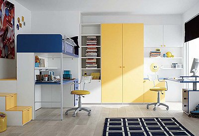 Headsets for children from the Italian manufacturer Battistella. Set includes bed, desks, computer desks, chairs and modular storage system for clothes and books. The furniture is made of chipboard. The front laminate. The surface is treated with varnish from the range of the campaign. Set a contemporary style. Colors: white, yellow, blue.