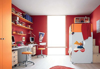 Headsets for children from the Italian manufacturer Battistella. Set includes two computer desks, swivel chairs, bunk bed, wardrobe and modular system of shelves. The furniture is made of chipboard. The front laminate. The surface is treated with varnish from the range of the campaign. Set a contemporary style. Colors: natural wood color, white, orange.