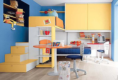 Headsets for children from the Italian manufacturer Battistella. Set includes a bed, Desk, and computer Desk, swivel chair, bedside Cabinet and modular storage system. The furniture is made of chipboard. The front laminate. The surface is treated with varnish from the range of the campaign. Set a contemporary style. Colors: white, yellow, orange, red, blue.