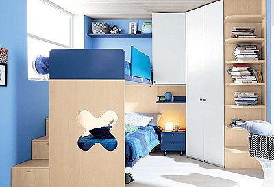 Headsets for children from the Italian manufacturer Battistella. Set includes two single beds, bedside tables and modular storage system. The furniture is made of chipboard. The front laminate. The surface is treated with varnish from the range of the campaign. Set a contemporary style. Colors: Natural wood color, white, blue.