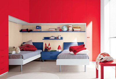 Headsets for children from the Italian manufacturer Battistella. Set includes two single beds, bedside table, Desk and modular storage system. The furniture is made of chipboard. The front laminate. The surface is treated with varnish from the range of the campaign. Set a contemporary style. Colors: white, red, blue.