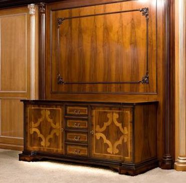 A chest of drawers from the Italian producer Giorgio Piotto. The frame is made from wood of valuable breeds. Model two door, with four drawers. The doors are lockable, decorated with inlay. The base and the side parts decorated by hand carved. Accessories metal. The model is made in classic style.