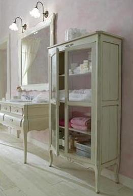 A linen from the Italian producer Giorgio Piotto. The frame is made of wood. Cabinet painted white, with the effect of oldness, decorated with thread and metallic inserts in silver color. Model on high curved legs, two door with three removable shelves. The doors are glass. The Cabinet is designed in classic style.