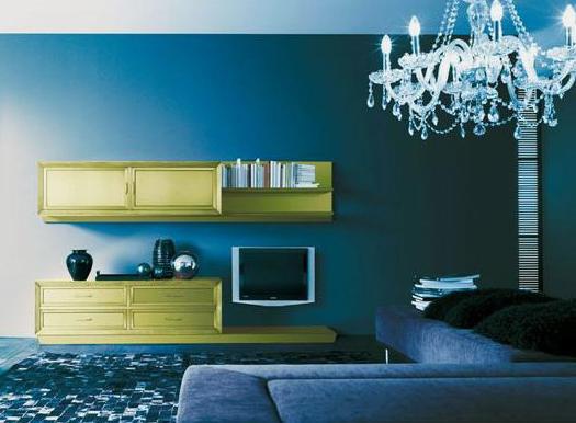 Compact shelving from the Italian company Giorgio Piotto. The frame is made from wood painted pale green. The model consists of two parts: the outdoor part with four drawers and a niche for the TV and hanging book shelf. Accessories plastic or wooden, to match the furniture. The model is made in modern style.