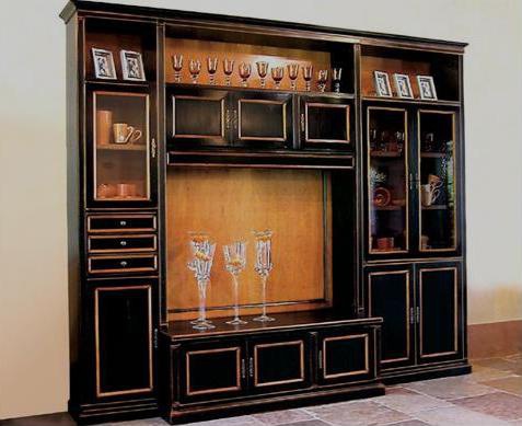 Wall in a modern style from Italian producer Girgio Piotti. The frame is made of smooth wood. Model with niche for TV, drawers and shelves. The doors are glass and wood. The wall is painted black. Accessories and decorative inserts on the panels of the drawers and doors contrasting light brown color.