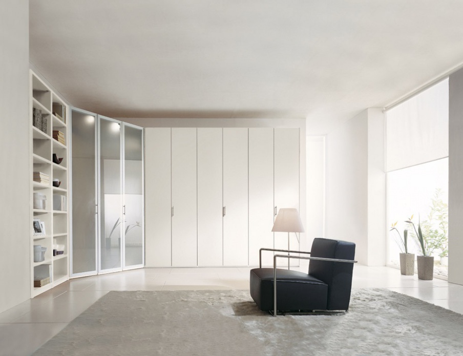 Wardrobe Anta Tecnica Piana from the Italian manufacturer Fimar. The frame is made from solid wood. The finishing - varnish. Some of the doors - made of glass. Color scheme - white. A corner Cabinet is designed in modern style.