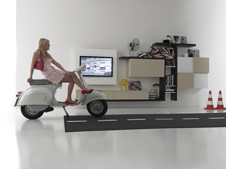 Furniture for TV Ok, from the Italian manufacturer Fimar. The frame is made from solid wood. The finishing - varnish. The model contains many shelves. Sections - open and closed. The model includes a special section for TV and wall cabinets. Colors - white and black.