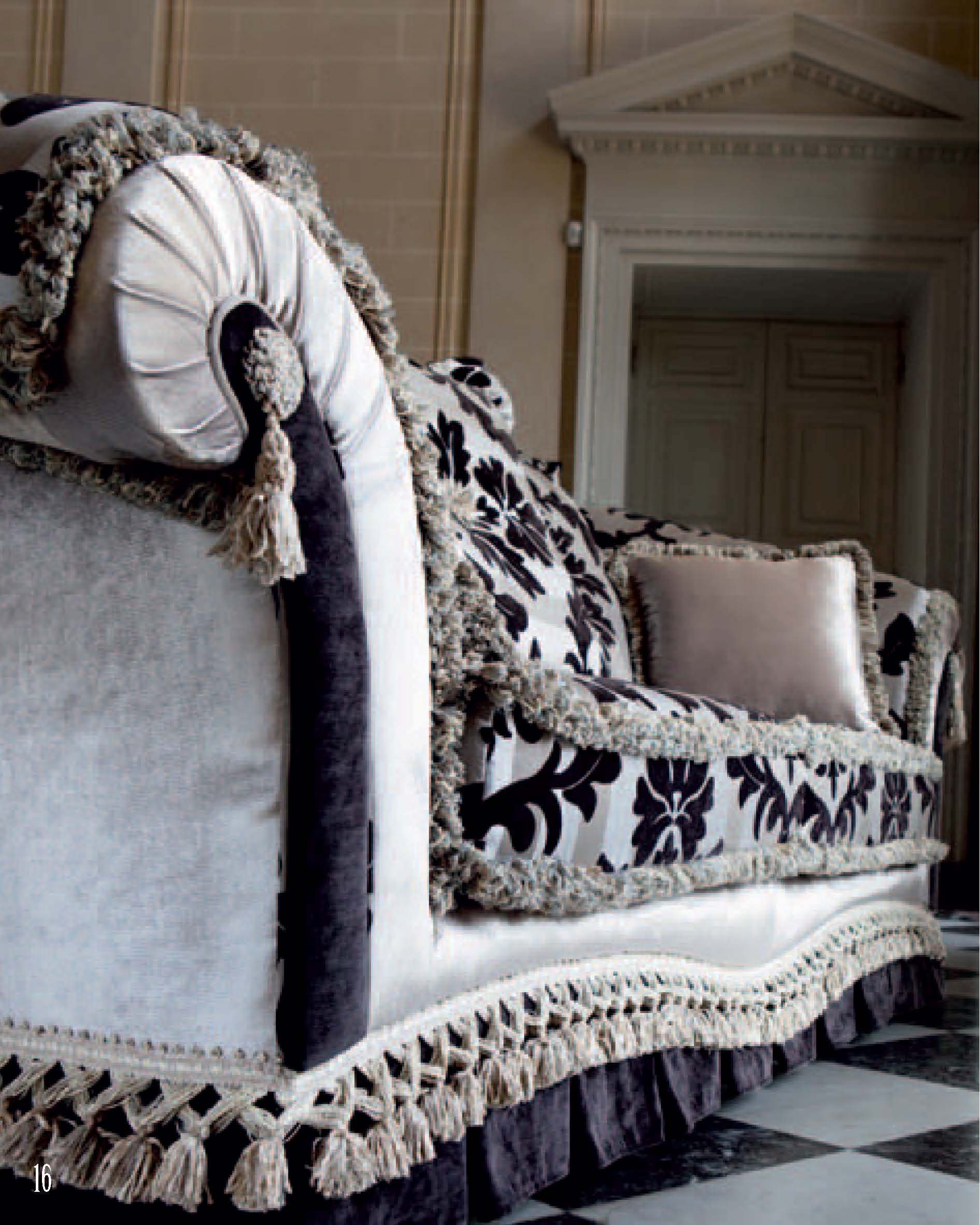 Two seater sofa with high back from Classico Italian producer Domingo Salotti. The frame is made from solid wood, upholstery - cloth from a range of campaigns. The base is hidden "with a decorative skirt." The seats are removable. Product in a classic style. The design of complementary decorative pillows. Colours in stock.