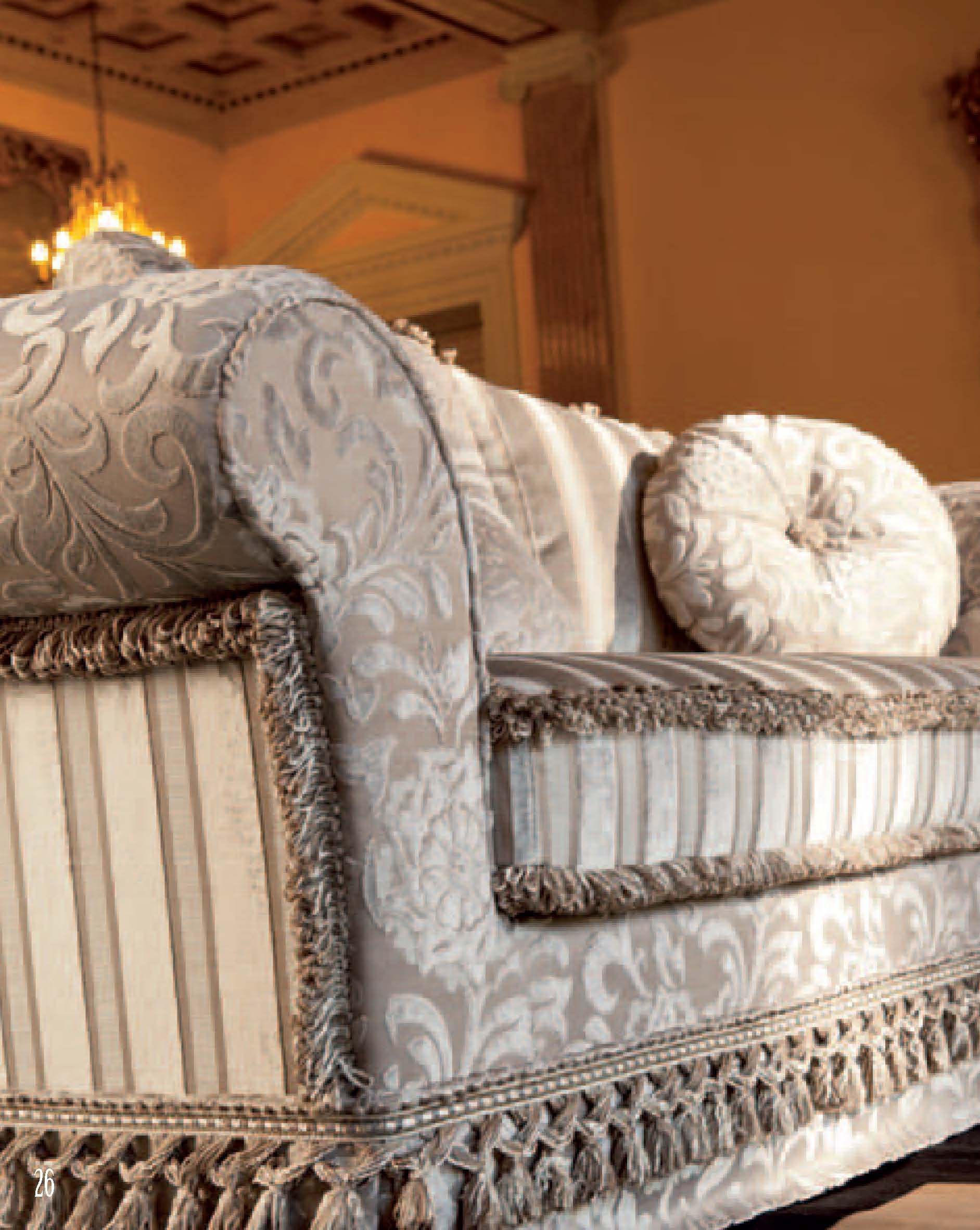 Two seater sofa Classico from the Italian manufacturer Domingo Salotti. The frame is made from solid wood, upholstery - cloth from a range of campaigns. The base is hidden a decorative "skirt". The seat is removable. Product in a classic style. The design of complementary decorative pillows of different shapes. Colours in stock.