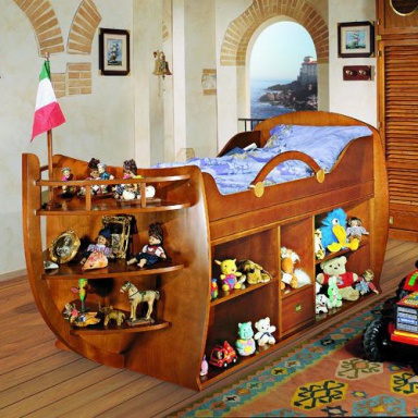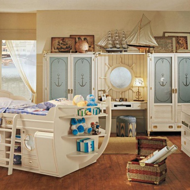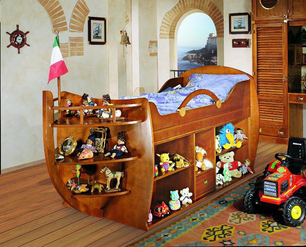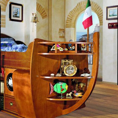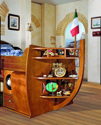 The bed in the shape of a boat Capitano from the Italian manufacturer Caroti. Presents a model of the crib in the form of a bridge, ladder, drawers and compartments for storage. Furniture made from solid wood, greening liquid lacquer finish, natural mahogany or a choice from the catalogue, the accessories are made of brass. Design solution for classic children room in marine style.