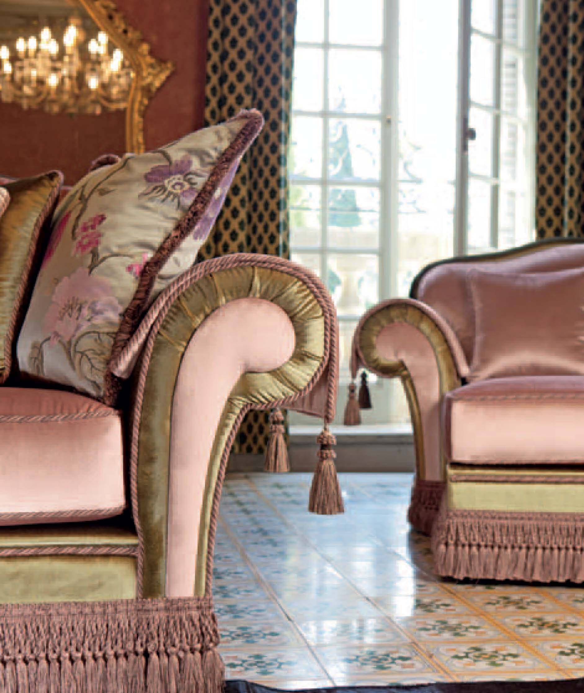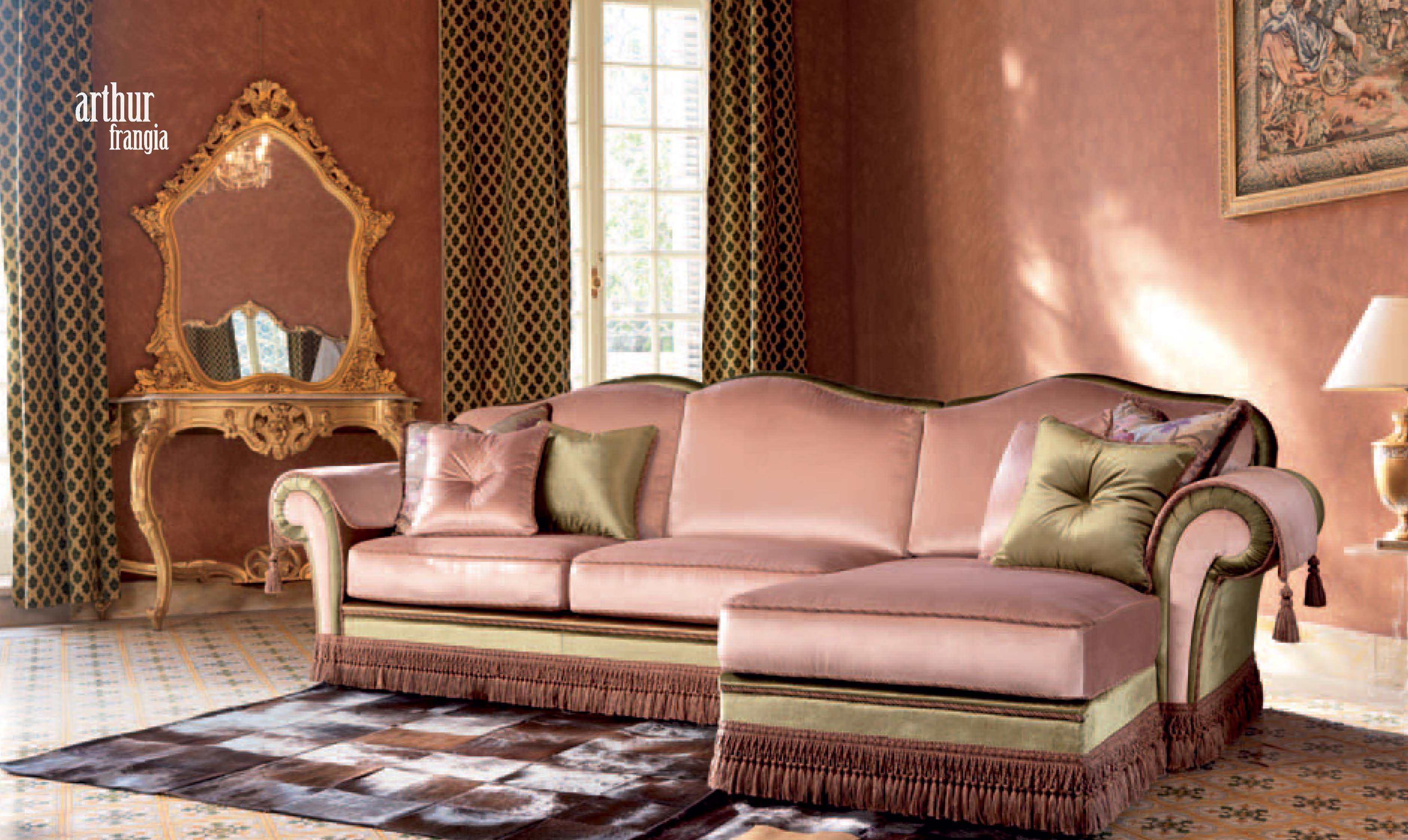 Corner sofa Classico from the Italian manufacturer Domingo Salotti. The frame is made from solid wood, upholstery - cloth from a range of campaigns. The base is hidden a decorative "skirt". The seats are removable. The design of complementary decorative pillows. Colours in stock.
