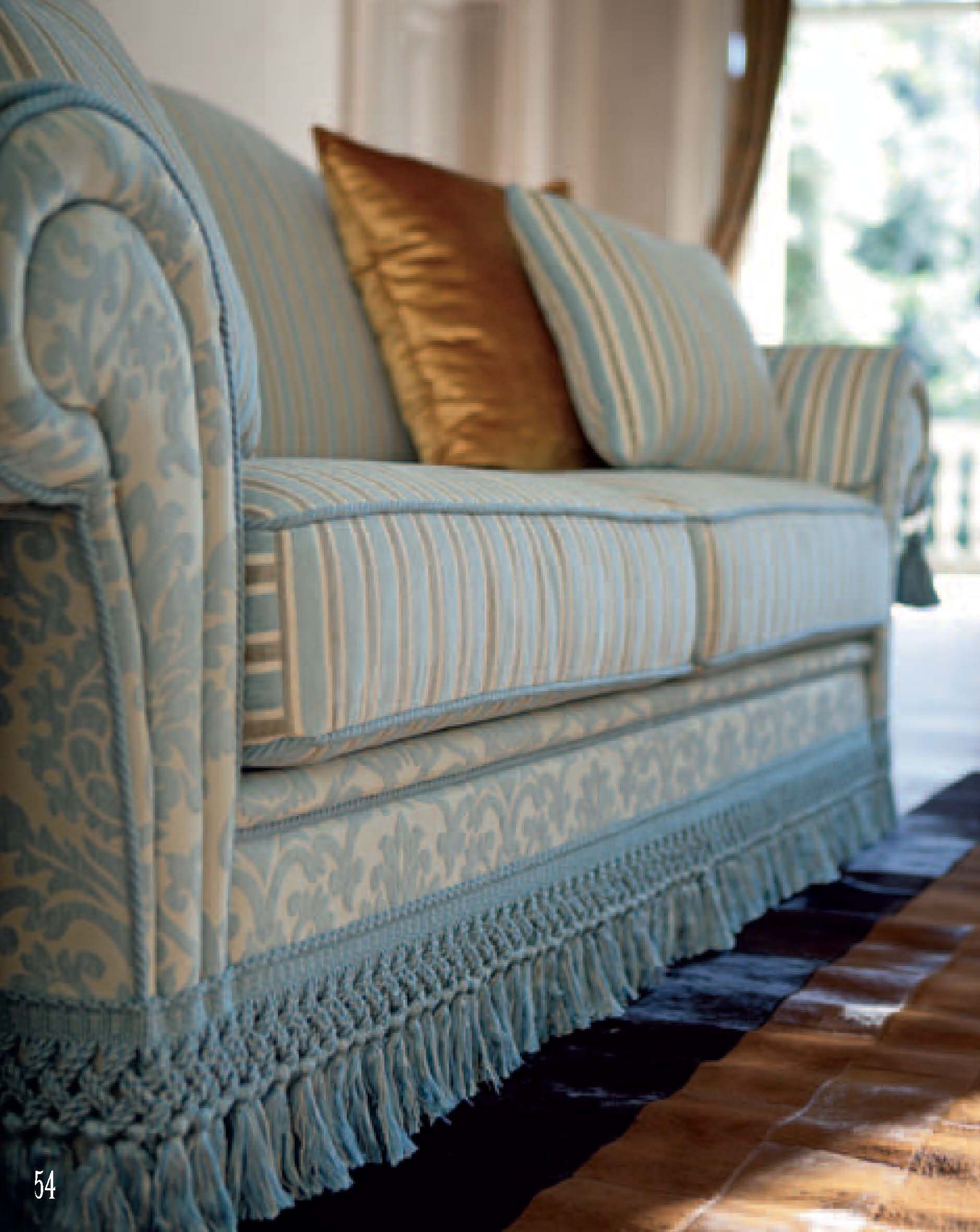 Two - three seater sofa Classico from the Italian manufacturer Domingo Salotti. The frame is made from solid wood. Upholstery fabric from a range of campaigns. The base is hidden a decorative "skirt". The seats are removable. A lovely choice for the living room in a classic style. The design of complementary decorative pillows. Colours in stock.