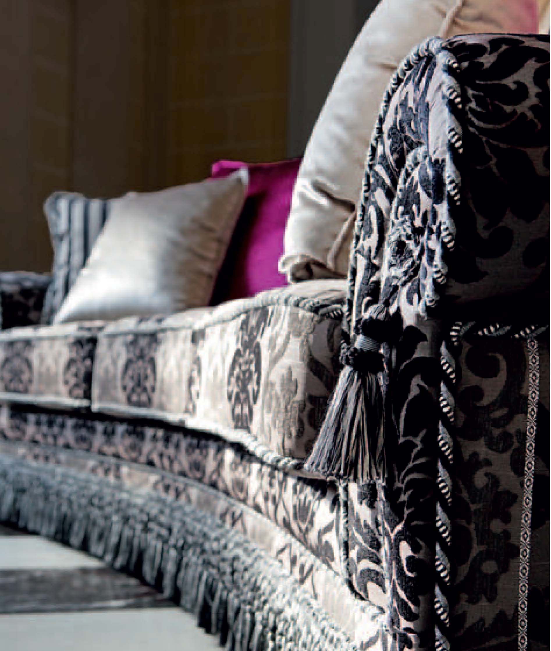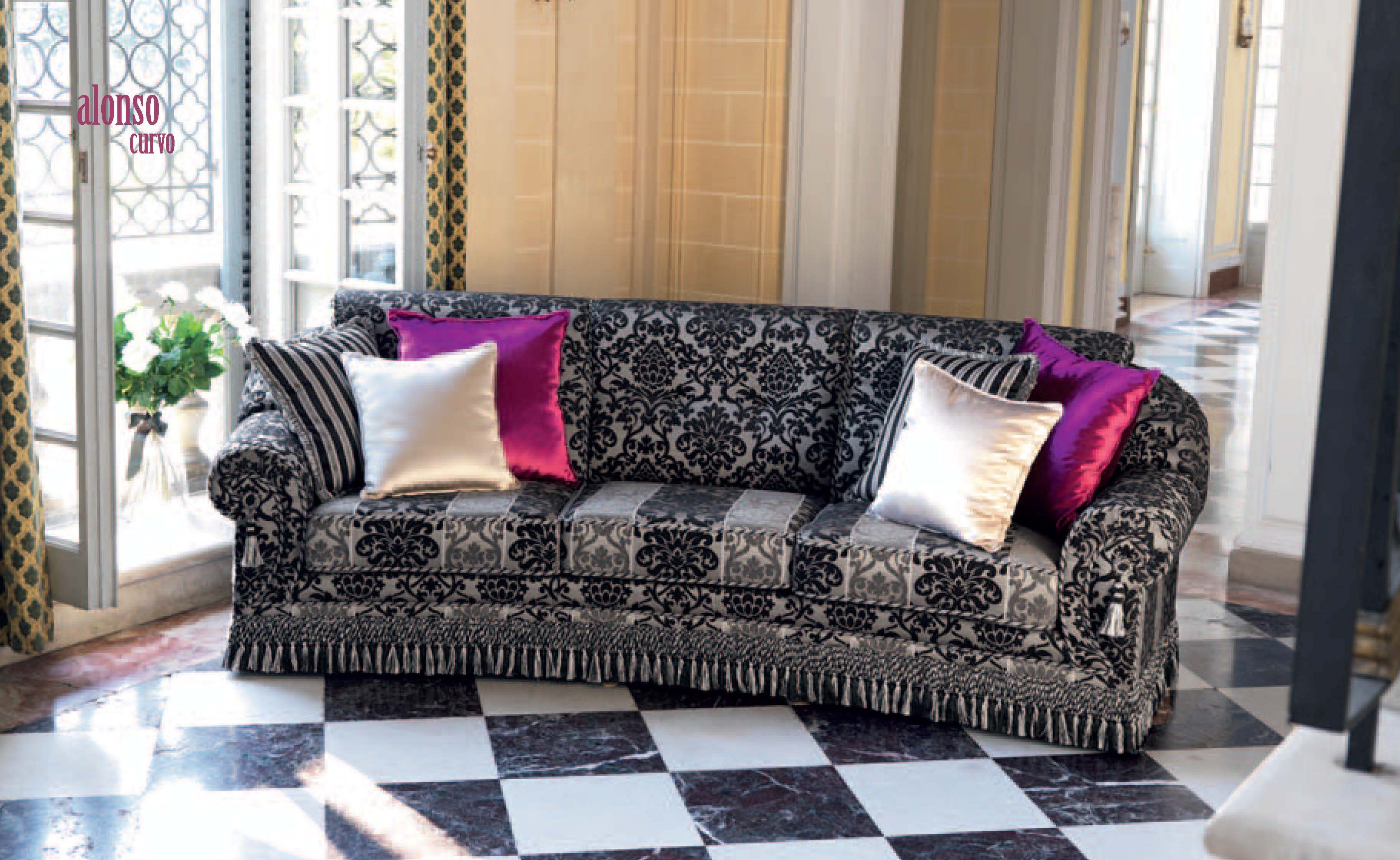 Three seater sofa Classico from the Italian manufacturer Domingo Salotti. The frame is made from solid wood. Upholstery - textiles from a range of campaigns. The seats are removable. The model is designed for the living room in a classic style. The design of complementary decorative pillows. Colours in stock.