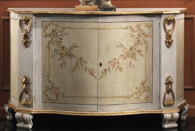 A chest of drawers from Italian manufacturer Vittorio Grifoni. Model low on bent legs. Body and top made from solid wood. Finish option to choose from a collection company. Decoration is the decorative carving and hand painting.