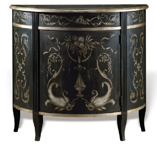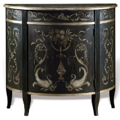 A chest of drawers from Italian manufacturer Vittorio Grifoni. The frame and legs are made of solid wood. The surface is painted in black. Accessories metal. The design complements decorative painting handmade.