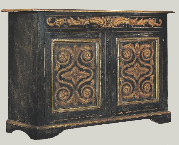 A chest of drawers from Italian manufacturer Vittorio Grifoni. Consists of two drawers and two sections with hinged doors. Inside there are shelves for storage. Material - solid wood. The varnish finish offered in black. The model is decorated by handmade paintings.