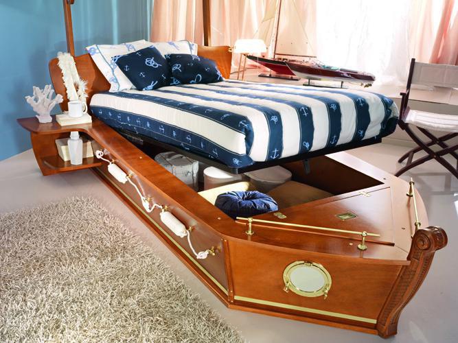 Bed Calafuria from the Italian manufacturer Caroti. Presents a model of the bed on a wooden frame with lifting mechanism and a canopy, made of genuine mahogany, parts made from brass in the shape of a porthole. The functional use of all spaces, as in best Maritime traditions. Great option for a child's room in classic style with sea motifs.
