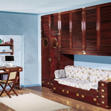 Proposta set from the Italian manufacturer Caroti. The presented model of the Desk with shelf for keyboard and drawer, the Cabinet with double doors blinds and sofa beds with drawers. Furniture made of solid mahogany wood, the metal fittings of Golden color. The perfect solution for teen room or guest room in a nautical theme