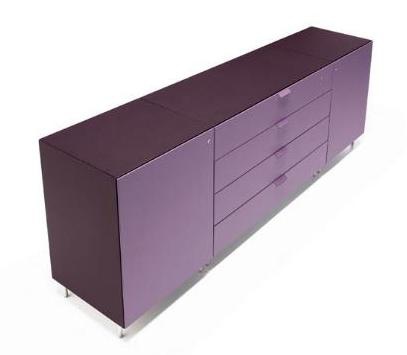 Altagamma stand from Italian manufacturer Frighetto. The frame and legs aluminium. Model two door, with four wide drawers. The doors and the top drawer can be locked. Dresser is painted in purple color, made in a modern style.