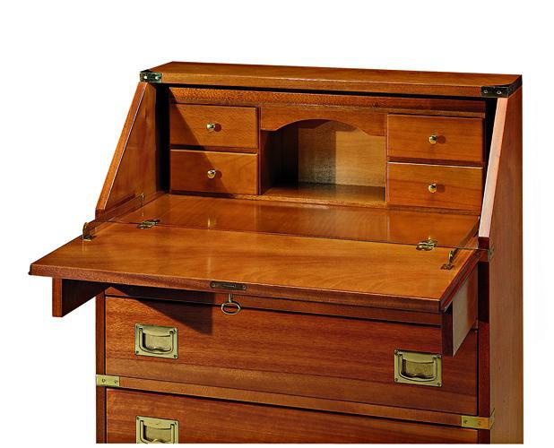 Secretaire Maria Vecchia from the Italian manufacturer Caroti. Dresser with drawers and a hinged lid. The model can be used as a Desk. The furniture is made of natural mahogany or a choice from the range, the metal fittings with Golden finish. Design solution in a marine motif for a nursery.