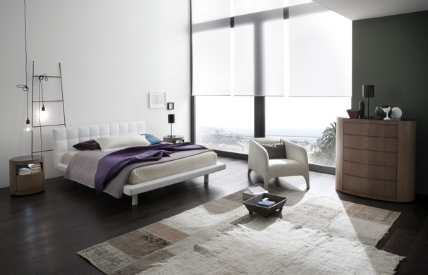Set to Oblo bedrooms from Italian manufacturer Vittoria. Set includes: double bed with high headboard and a soft, roomy chest of drawers and bedside tables. The frames are made of wood. Upholstery headboard - textiles catalogue of the manufacturer. The model is made in modern style. Colours - white, brown. A chest of drawers and bedside tables are made in an oval shape. Bed legs are made of metal. The facades of models varnish.